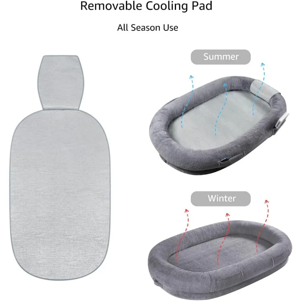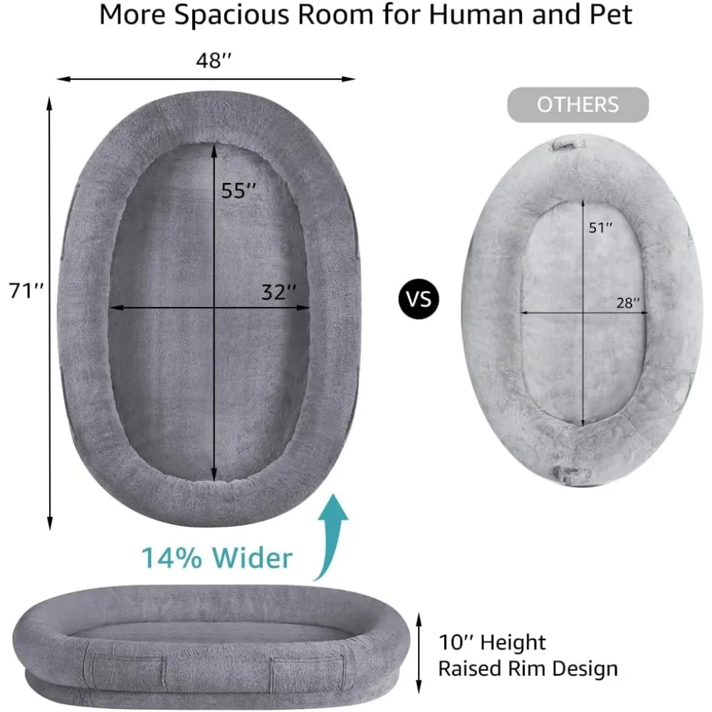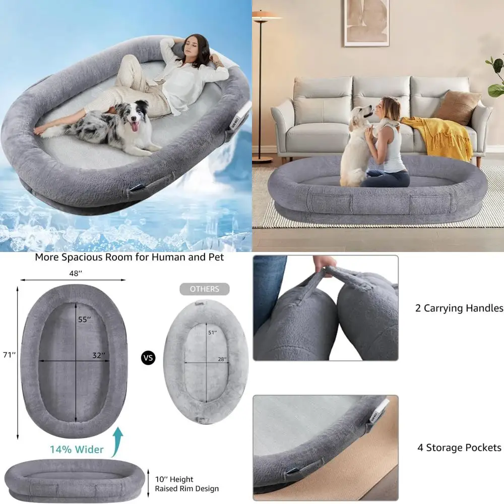 This product is a versatile and comfortable human dog bed designed for both you and your pet's relaxation. It features a removable cooling pad for instant summer comfort and can be taken off for a cozy winter experience. The bed is spacious, offering ample room for you and your pet to unwind together, enhancing your bond and daily happiness. It includes four pockets for convenient storage of phones, books, and other essentials, as well as two handles for easy carrying. Made from super soft plush fabric and supportive foam, this dog mattress provides ultimate comfort, and its removable cover is easy to clean, ensuring a healthy living environment. The ergonomic design offers excellent support and is suitable for pets of all sizes, with an ideal height for easy access and reduced risk of injury. The sleek modern style of this human-sized dog bed complements various home decors and has received OEKO-TEX certification, making it a stylish and functional addition to your living space.